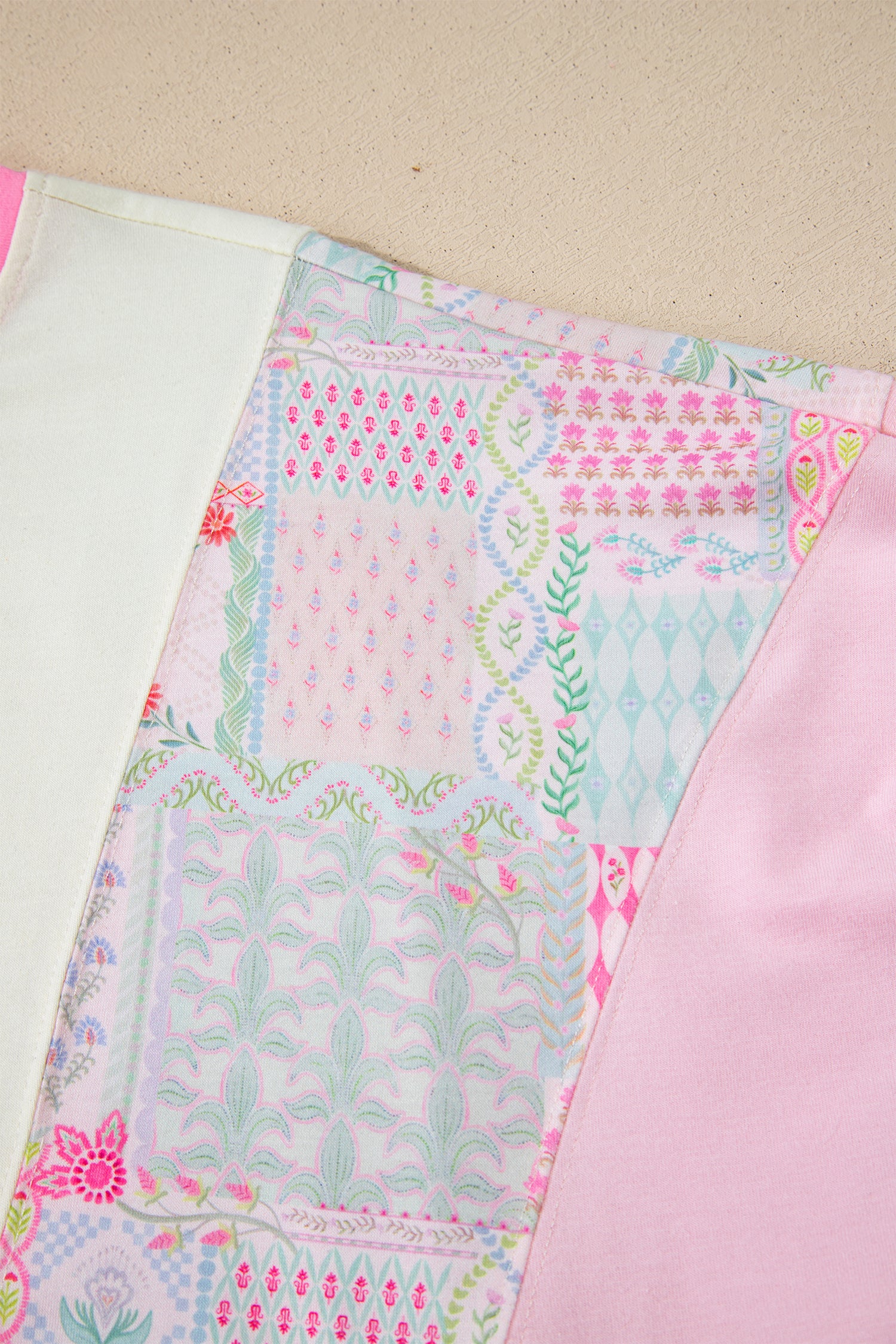 Beige Color Block Floral Patchwork Big Flower Accent Relaxed Top