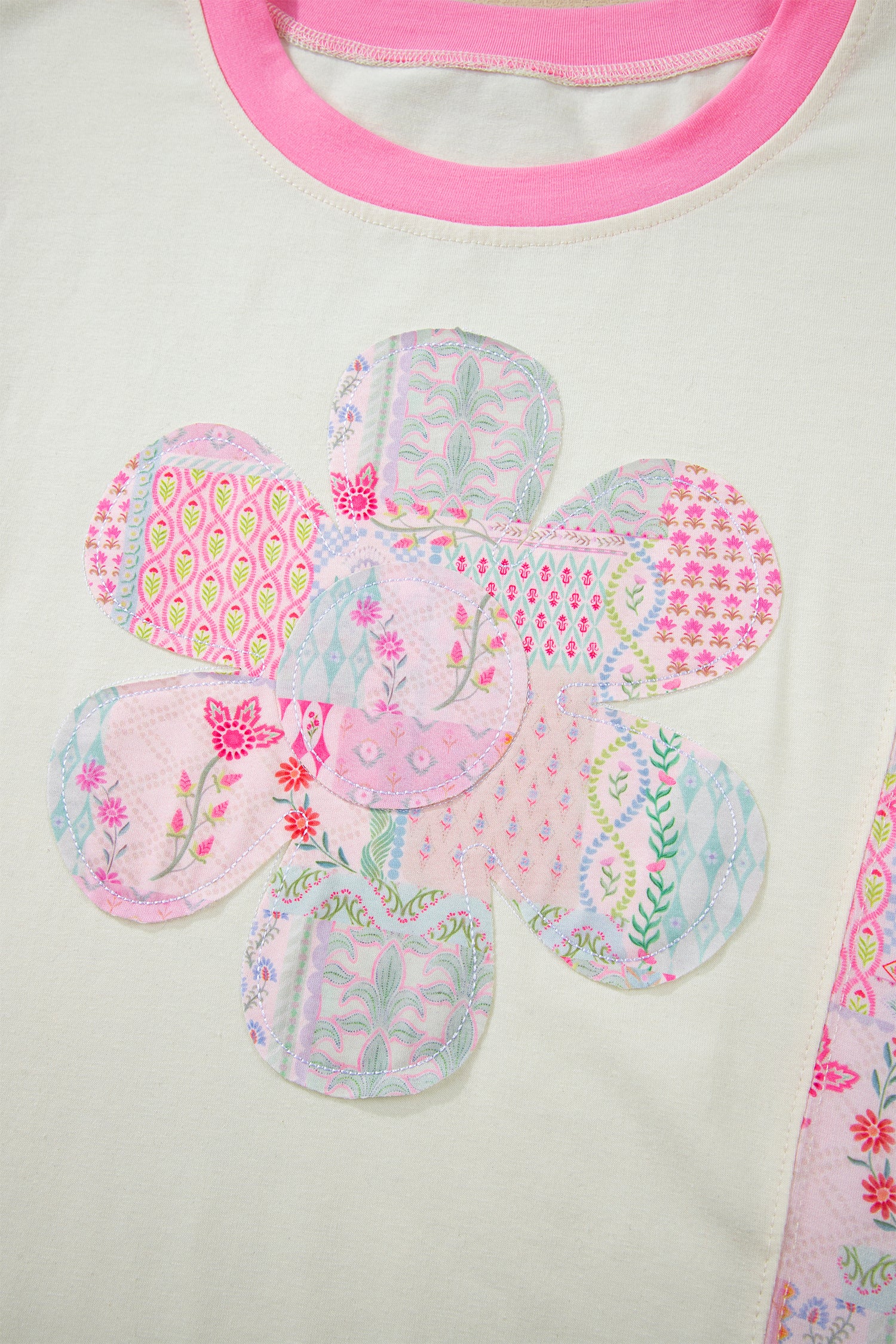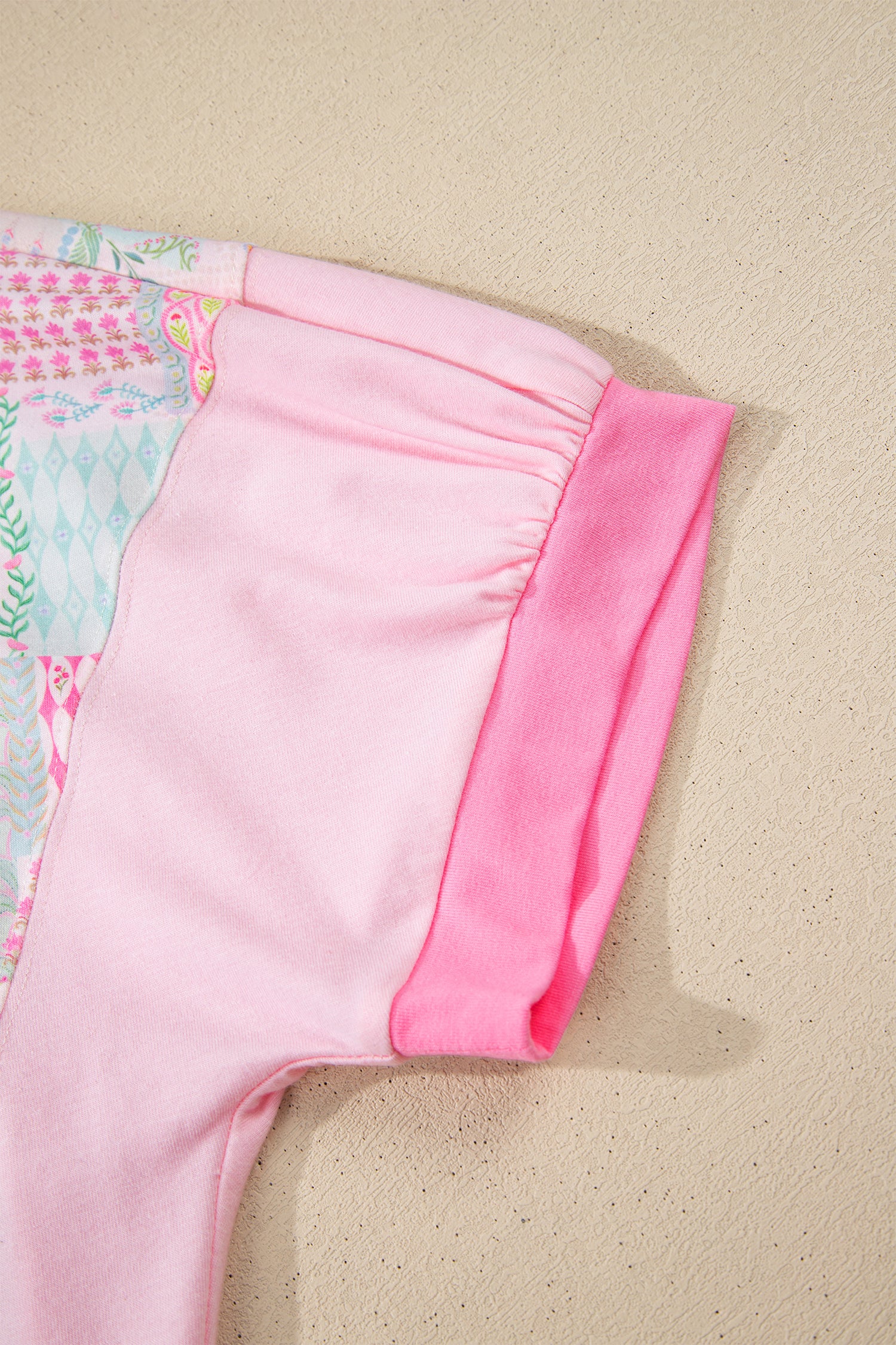 This relaxed short sleeve top has a chic color block and floral patchwork.
