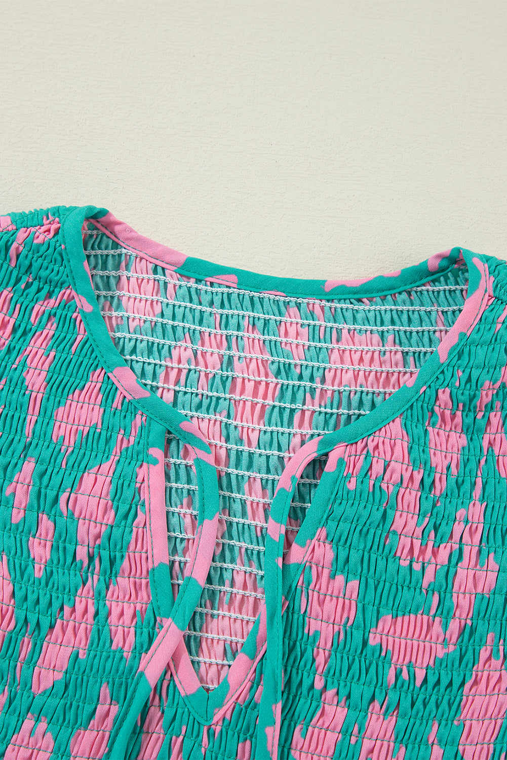 Green Abstract Print Puff Sleeve Tied Notched Neck Long Dress