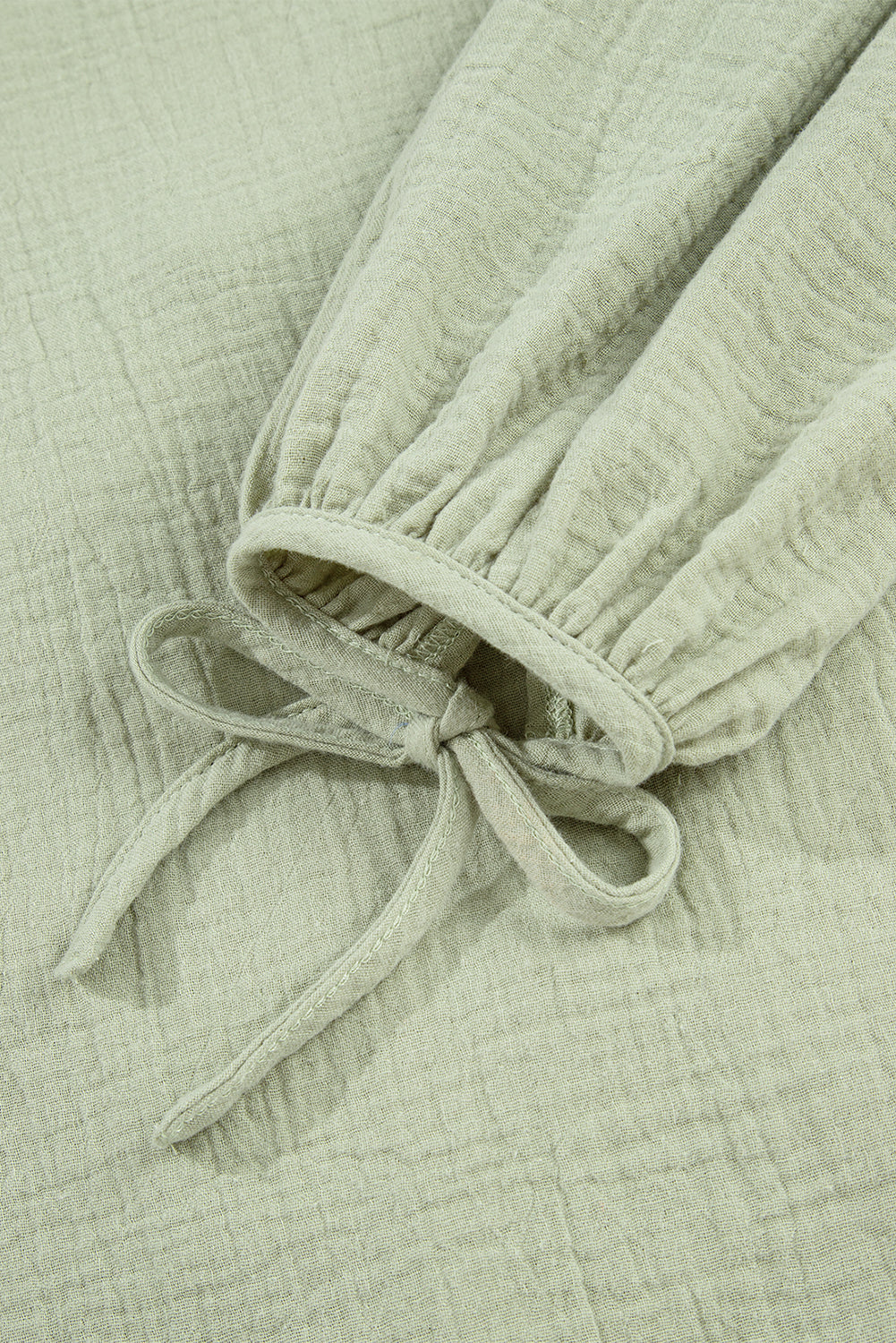 Meadow Mist Green Bow Tie Front Ruffle Trim V Neck Long Sleeve Gauze Blouse