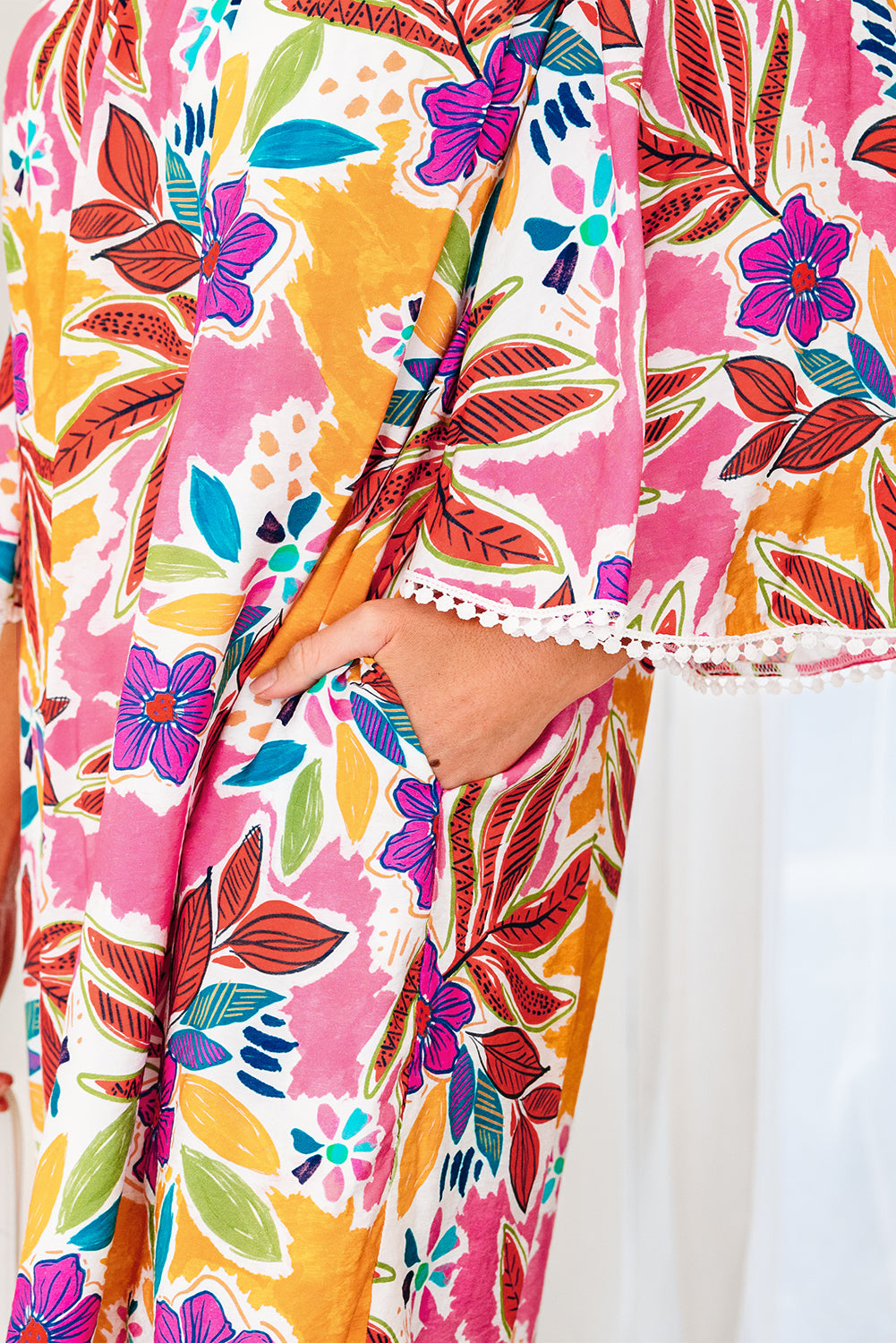 Pink Floral Print Lace Trimmed Tie Back Bell Sleeve Swing Mini Dress